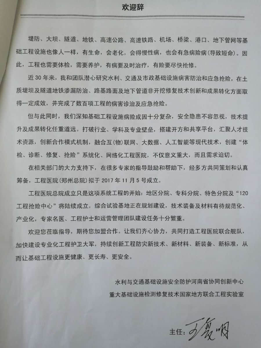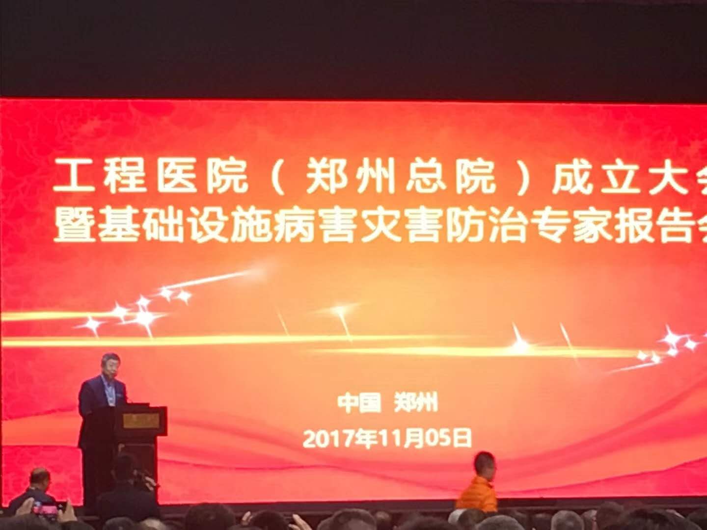 公司受邀參加工程醫(yī)院(鄭州總院)成立大會暨基礎(chǔ)設(shè)施病害災(zāi)害防治專家報告會 11月5日,工程醫(yī)院(鄭州總院)成立大會暨基礎(chǔ)設(shè)施病害災(zāi)害防治專家報告會,在河南省黃河迎賓館迎賓會堂舉行。來自全國科研院所、高校、機關(guān)和企事業(yè)單位的200余名代表,齊聚一堂,共襄盛舉。中國工程院院士鄭州大學(xué)校長劉炯天教授、工程院院士鄭州大學(xué)王復(fù)明教授和工程院院士青海大學(xué)校長王光謙教授等專家領(lǐng)導(dǎo)致辭并講話。中國工程院院士重慶大學(xué)校長周緒紅等9位專家做專場報告。我公司杜瀟總經(jīng)理受邀參加此次大會。